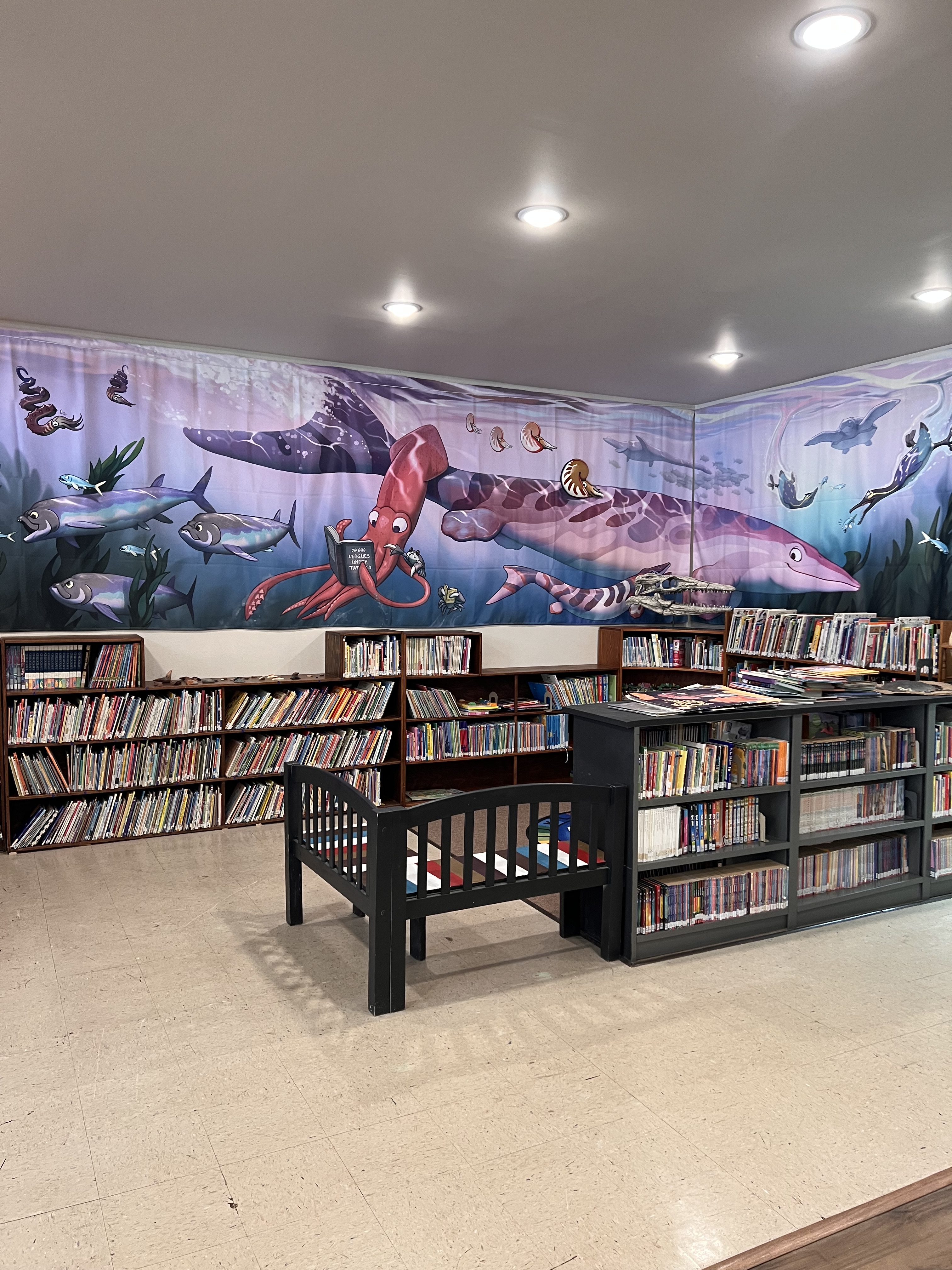 This is the new wall display that Clint Boyd put up. It is a mural of a Jormungandr Walhallaenis. It is from the species Mosasaur. Stop on in and see it.