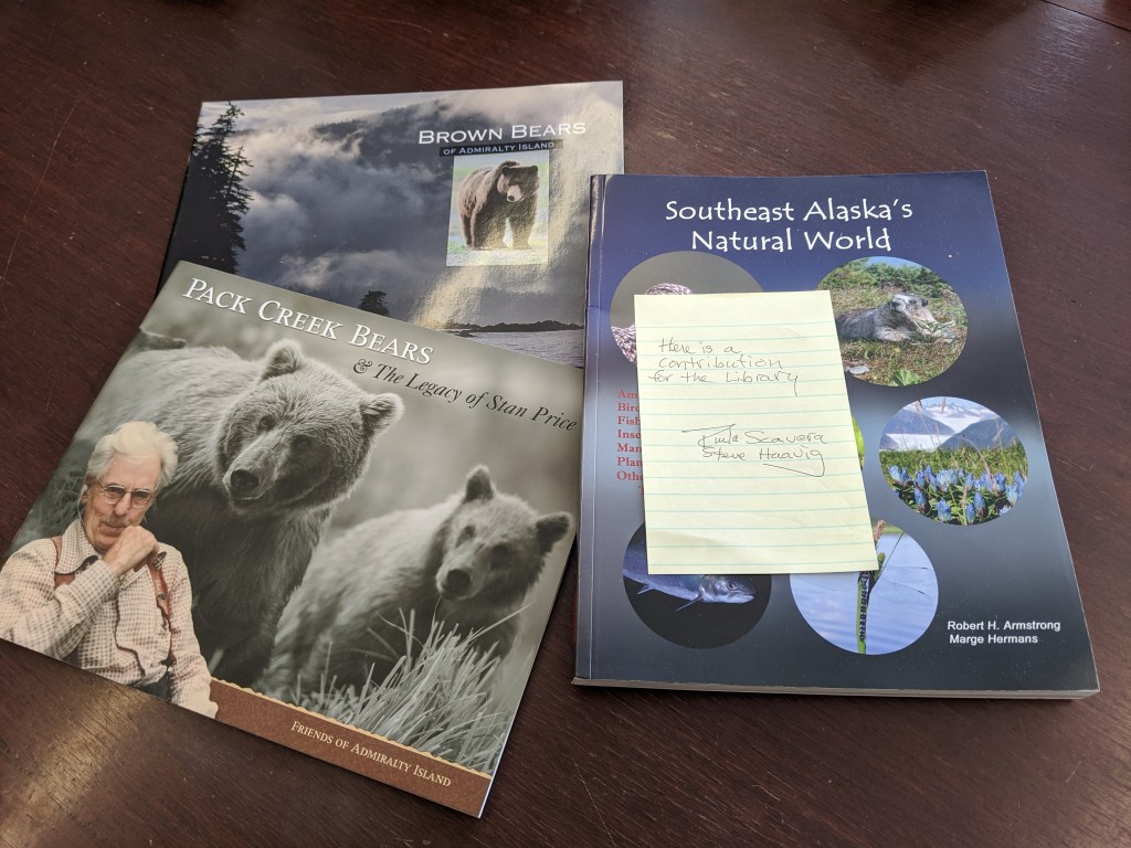 The library received three beautiful books from Paula Scavera and Steve Haavig, that have been added to our collection – Southeast Alaska’s Natural World, Brown Bears of Admiralty Island, and Pack Creek Bears & The Legacy of Stan Price. Thank you, Paula and Steve.